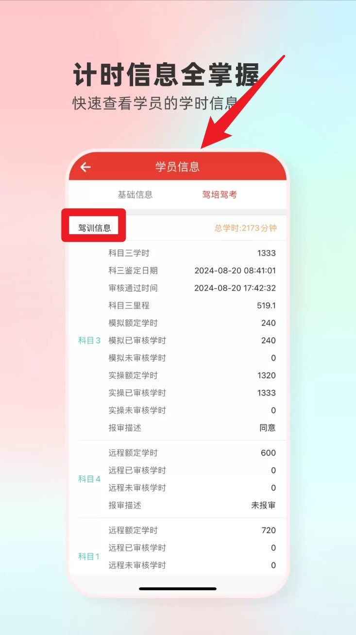 4.点击学员详情页中的驾训信息,可快速查看各科目已完成与剩余的学时,清晰掌握学员的学习记录和训练数据。