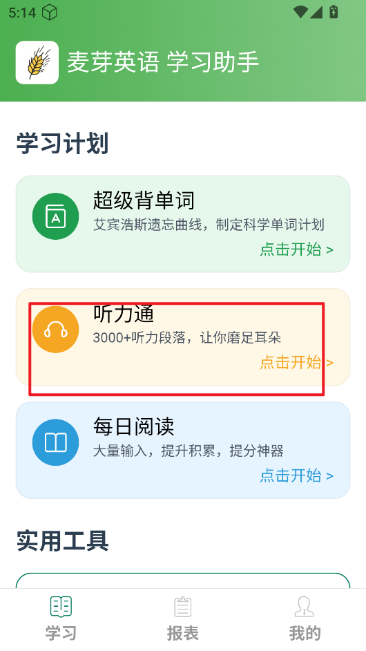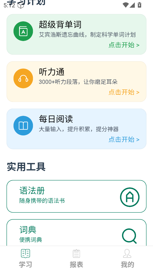 2、首页设有 “超级背单词”、“听力通” 等学习模块供挑选。