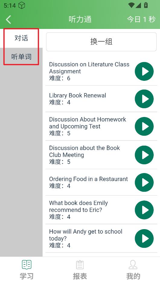 3、进入 “听力通” 后,可挑选听对话或听单词的训练模式。