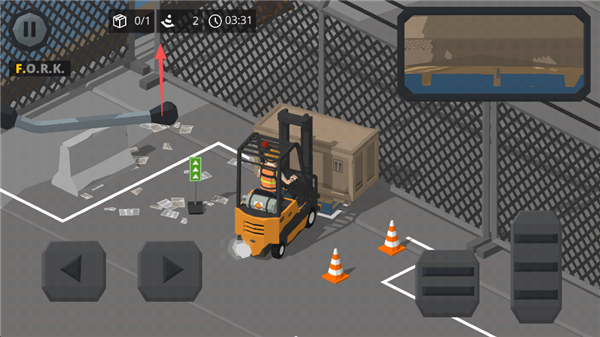 6、屏幕左侧的摇杆,按住向上向下,可以控制叉车设备的上升下降。
