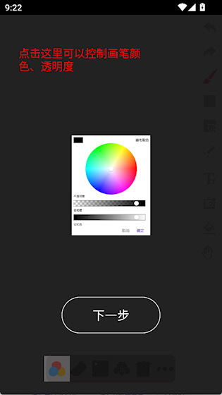 1、点击下方工具栏里的调色盘按钮控制画笔颜色