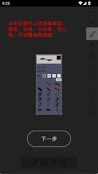 1、画笔多样可调:涵盖普通笔、钢笔等多种类型,可自定义粗细与颜色,通过调色盘选取或创建专属色彩,适配不同创作风格。