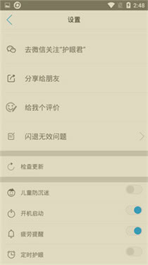 2、通过右上角设置入口可进入功能配置界面,提供包括儿童防沉迷、开机自启动、疲劳提醒和定时护眼在内的多项个性化选项。这些设置允许根据个人使用习惯进行灵活组合,实现从防沉迷到定时提醒的全方位护眼管理,满足不同场景下的视觉保护需求。