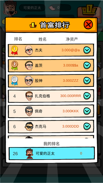 3、排名竞争:在富豪圈层的收益排行榜中全力冲刺,不断突破盈利上限,最终跻身商界顶尖行列,成为独树一帜的商业霸主。