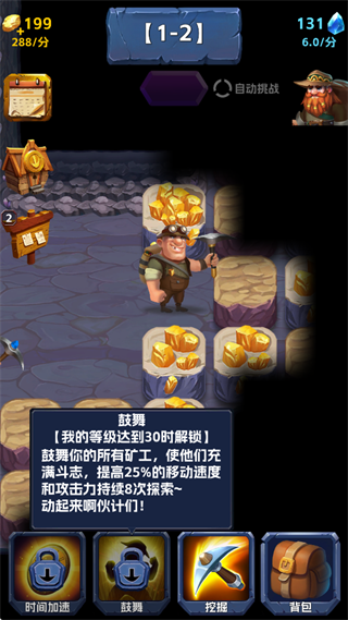 6、等级达到 30 级时解锁 “鼓舞” 功能:作用于所有矿工,使其充满斗志,8 次探索内提升 25% 移动速度与攻击力。