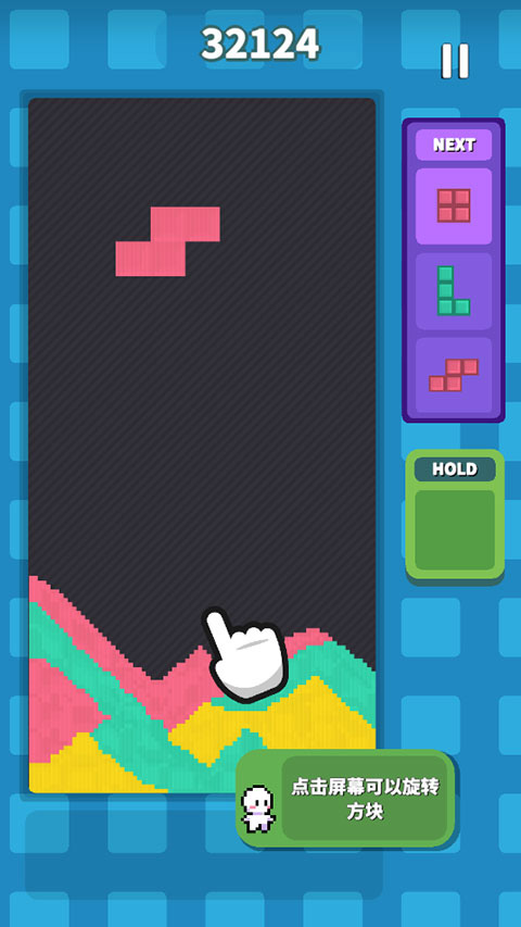 1、创新流沙机制:传统方块玩法基础上,加入流沙元素,方块落地成流沙,散落填补空隙,增加了游戏的不确定性和趣味性。