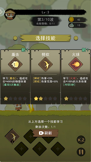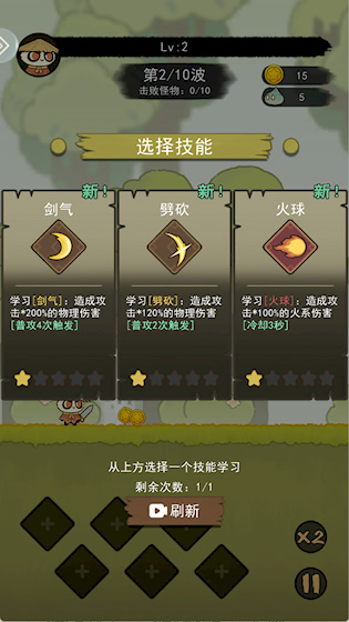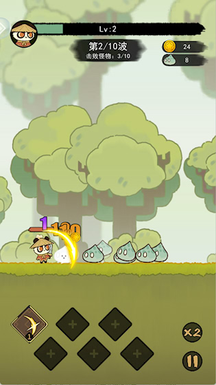 2、角色会自动攻击近身的敌人,点击右下角数字开启二倍速