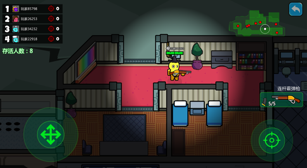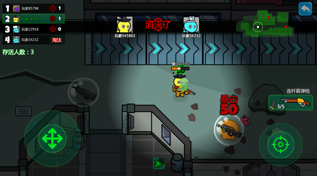 1、移动射击:通过虚拟摇杆控制角色移动,点击射击按钮瞄准击,同时注意走位,躲避障碍物。