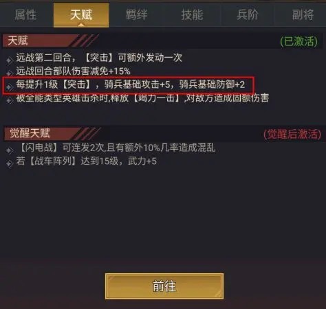 13、以末日邮差为例,每提升 1 级【突击】,骑兵基础攻击 + 5、骑兵基础防御 + 2.
