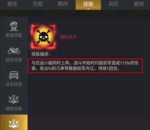 17、技能页签:技能分为英雄技能、骑兵技能、战车技能、辅助技能及合击技。