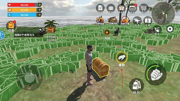 3、左上角的三个颜色条分别是生命值、饥饿值、水分,保持足够的数值才可以正常生存。