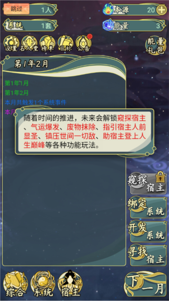 4、获得系统,与宿主绑定后,每月有一定几率触发系统事件