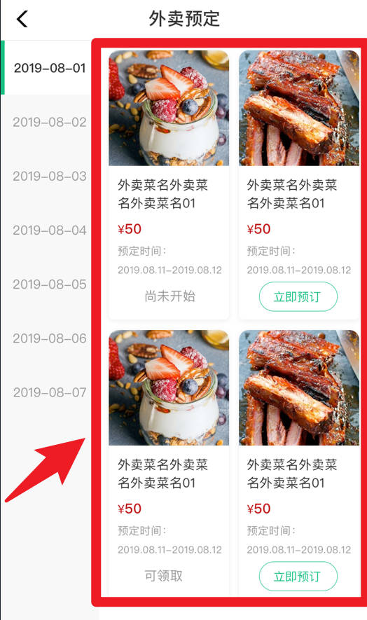 5、外卖预定页面会根据日期展示可选餐品,用户可提前下单预约,确保在指定时间取餐或享受送餐服务。