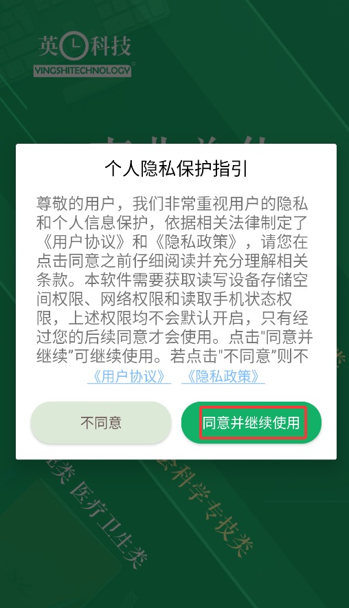 1、首次启动应用时,请点击弹窗中的同意选项,方可进入主界面开始使用。
