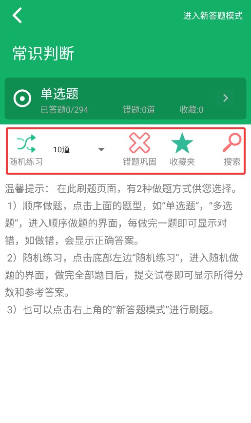 3、通过题型练习板块,可进行随机练习、错题巩固及收藏题目等操作。
