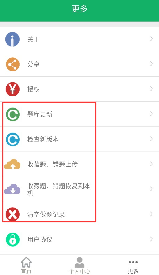 4、进入更多设置页面后,可管理题库更新、错题上传及本地恢复等功能。
