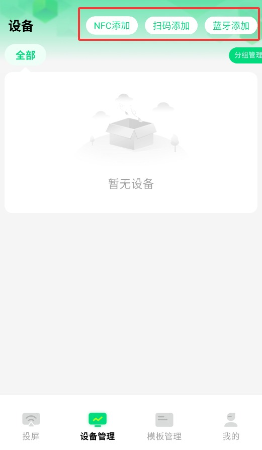 2、在设备管理板块,可通过NFC、扫码或蓝牙方式添加新设备进行连接。