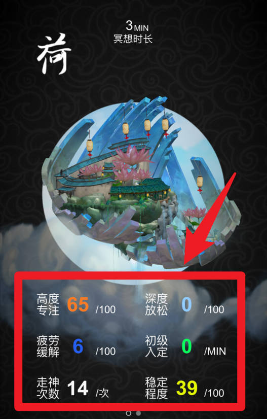 5、过程中,系统会生成专属报告,包含高度专注、疲劳缓解和稳定性等多维度数据,帮助你更好了解冥想效果。