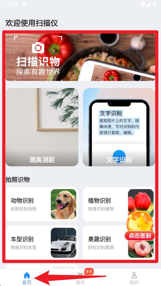 2、进入首页,可以使用拍照测距、面积测量、文字识别等核心功能,还能快速进入动物识别、植物识别等工具。