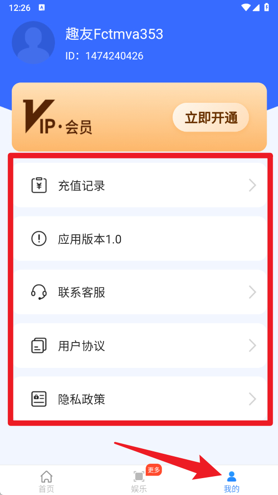 5、进入我的,可查看充值记录、联系客服、阅读用户协议与隐私政策,并进行账号管理。