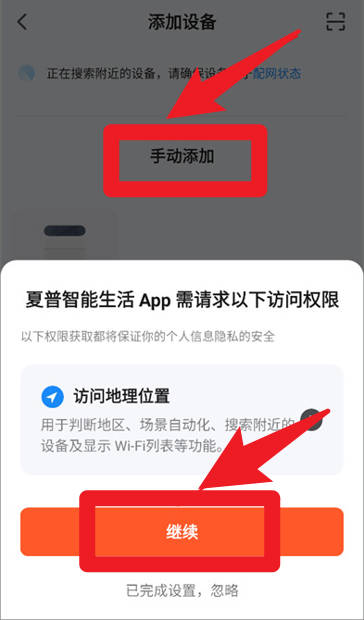 4、添加设备时,可以选择手动添加来绑定所需设备,系统会请求访问地理位置以便智能匹配与场景优化。