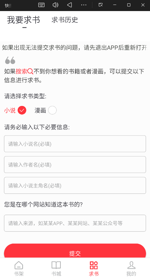 求书功能:若搜索不到想看的书,可手动提交求书信息。