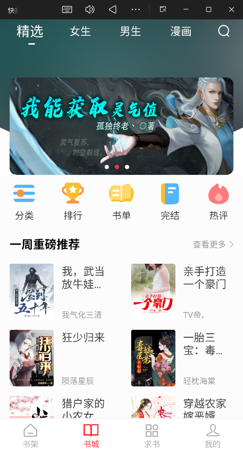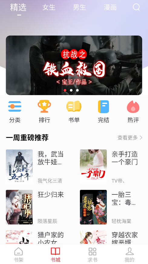 “一周重磅推荐”展示热门书籍如《我,武当放牛娃...》、《狂少归来》等。