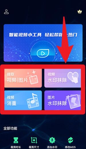 1、打开首页后可选择提取视频图片、水印抠除、视频消重等功能模块,点击后进入对应操作界面。
