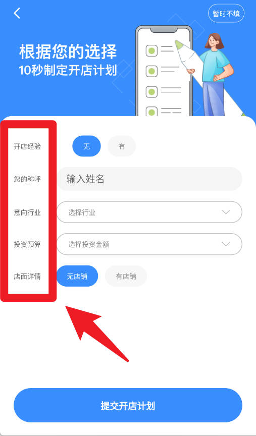 2、根据开店经验、意向行业、投资预算和店面详情填写资料,提交开店计划,系统会为用户生成个性化方案。