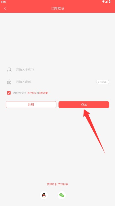 2、返回登录界面输入手机号和登录密码,勾选同意协议后点击登录按钮进入。
