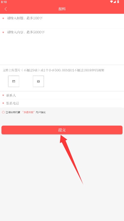 4、填写稿件标题名称和正文内容,上传相关图片素材并留下联系方式后提交审核。