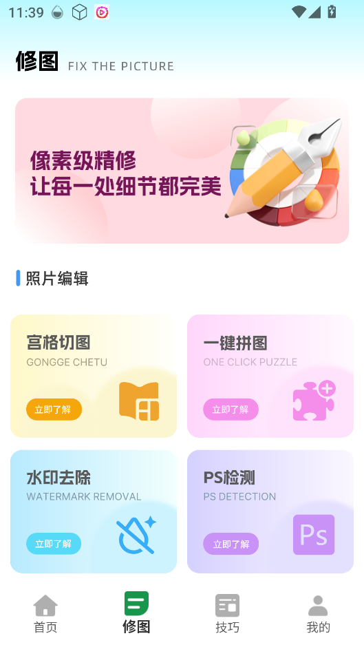 3、进入 “修图” 页面,能使用宫格切图、一键拼图等功能对图片进行编辑处理。