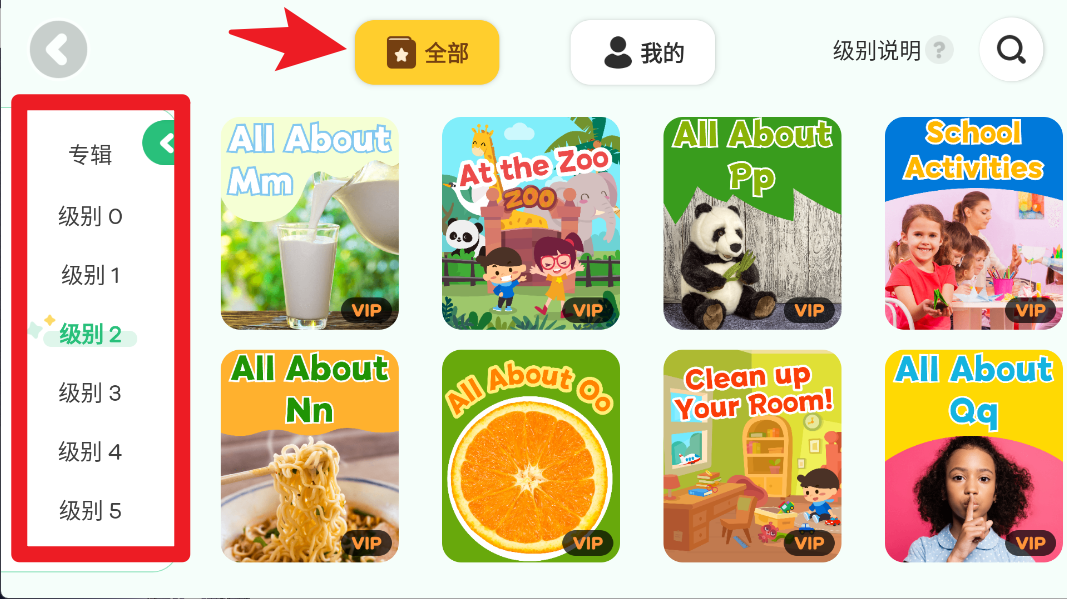 3、在图书馆页面,通过左侧筛选级别或专辑,右侧即可浏览各类分级绘本,选择适合孩子当前阶段的图书。