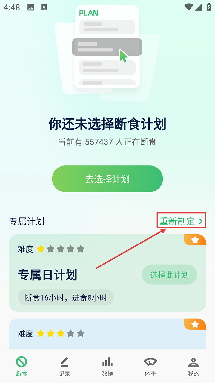 1、打开薄荷轻断食 APP,进入首页后,找到页面上方专属计划右侧的 “重新制定” 按钮并点击。