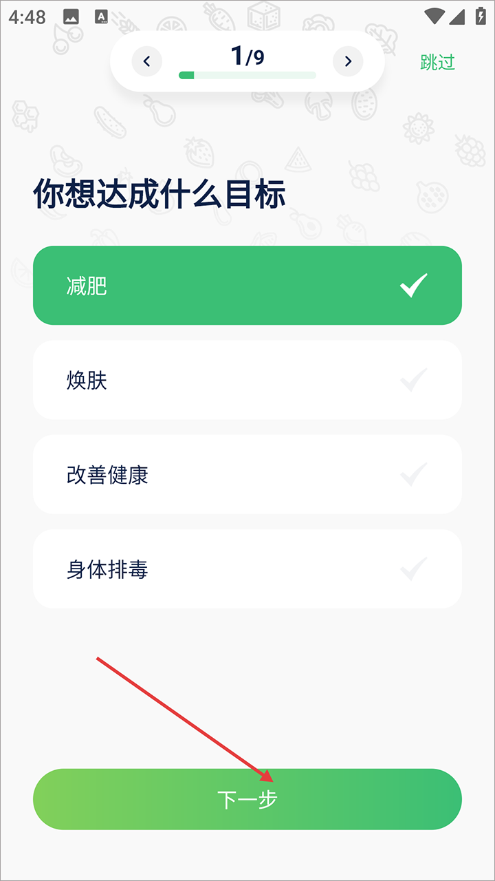 2、进入重新制定计划页面,按照页面提示依次选定自身目标,完成后点击下一步。