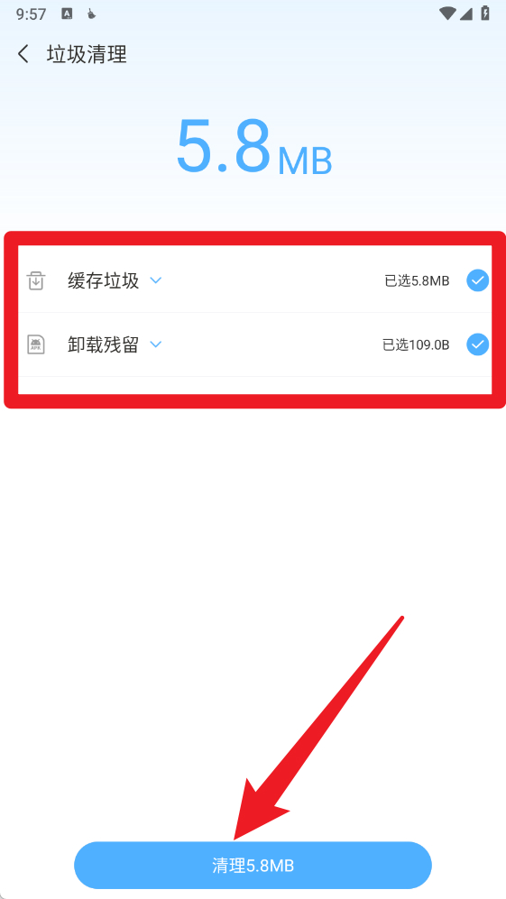 3、在垃圾清理界面中,可以勾选缓存垃圾和卸载残留文件,点击清理按钮即可释放空间。