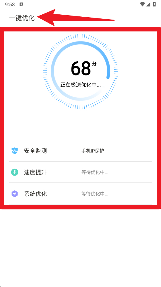5、在一键优化界面中,点击按钮即可启动手机加速和垃圾清理,系统会自动检测并优化性能。