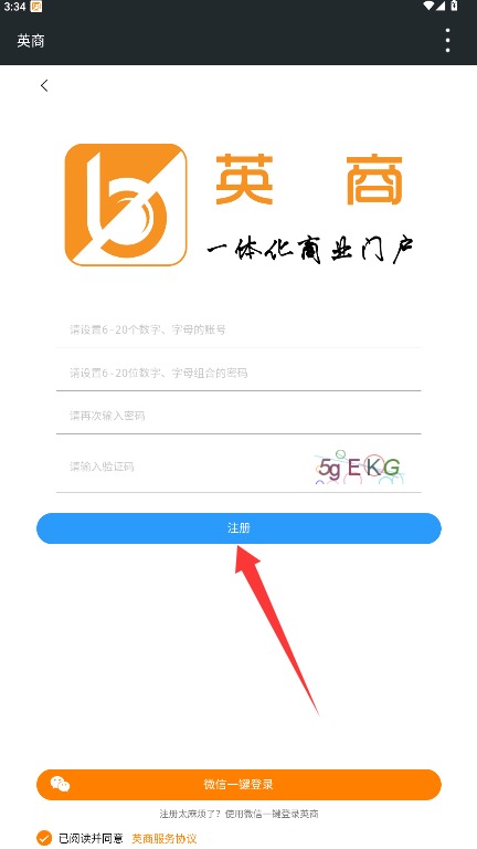 3、设置登录账号和密码信息,输入验证码并勾选同意服务条款后点击注册完成创建。