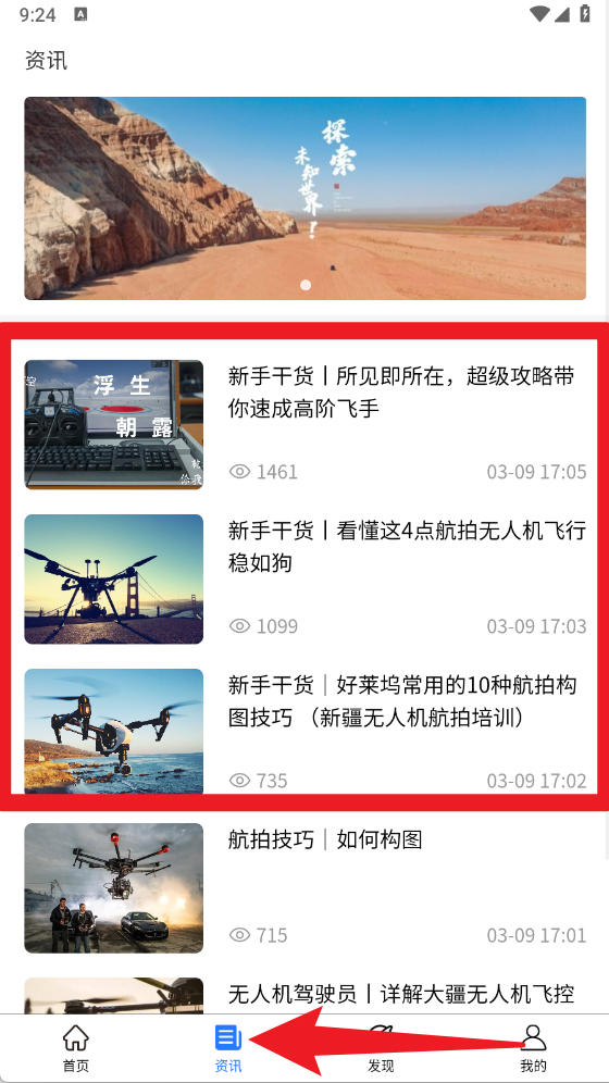 3、点击资讯页面,用户可浏览无人机相关的最新资讯与学习干货,拥有航拍攻略、行业动态,丰富知识储备。