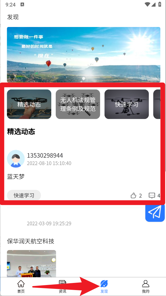 4、在发现版块中,用户能够查看精选动态与学习分享,能了解无人机法律法规,获取更多实用的学习与实操信息。