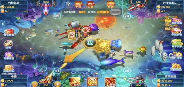 3、万炮来袭:内置多种类型、不同威力的炮塔可供选择,玩家可自由搭配使用,体验从轻度到重度的多元捕鱼快感。