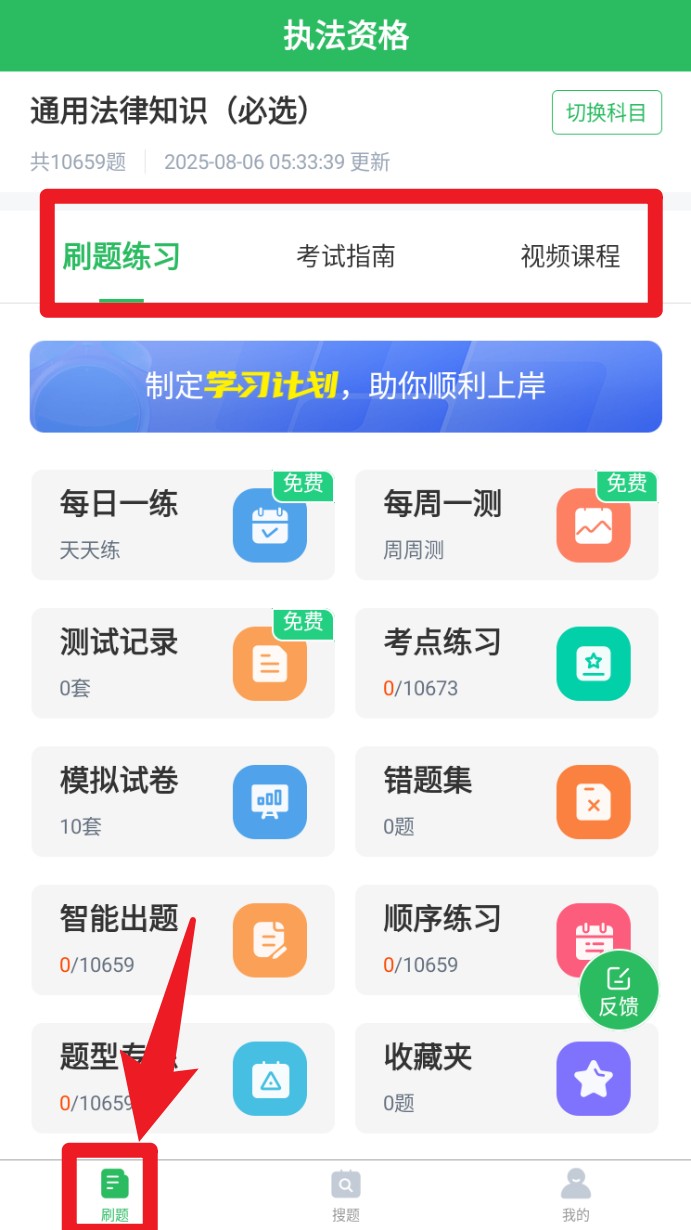 1. 进入首页点击下方刷题按钮,可查看每日一练、考点练习、模拟试卷等模块,自主选择练题方式。