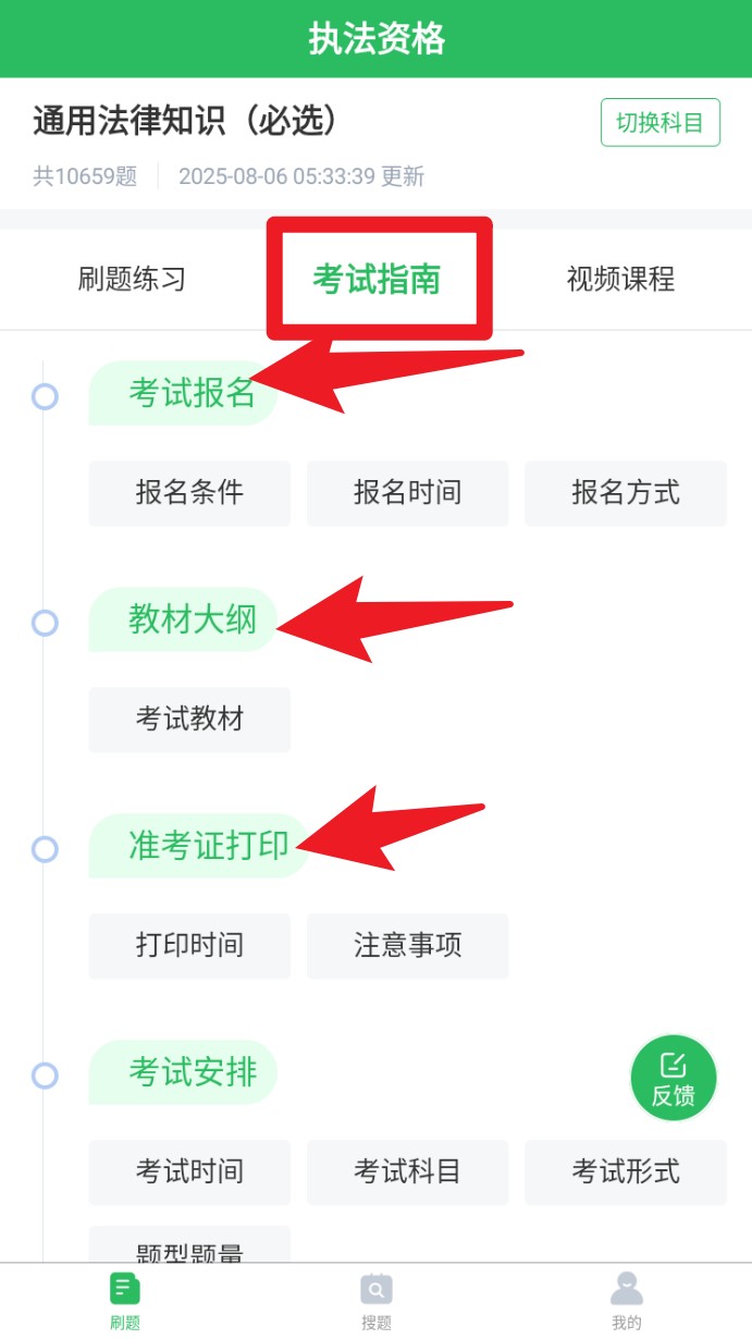 2. 切换至考试指南页签,了解考试报名、教材大纲、准考证打印等相关内容,快速掌握考试流程。
