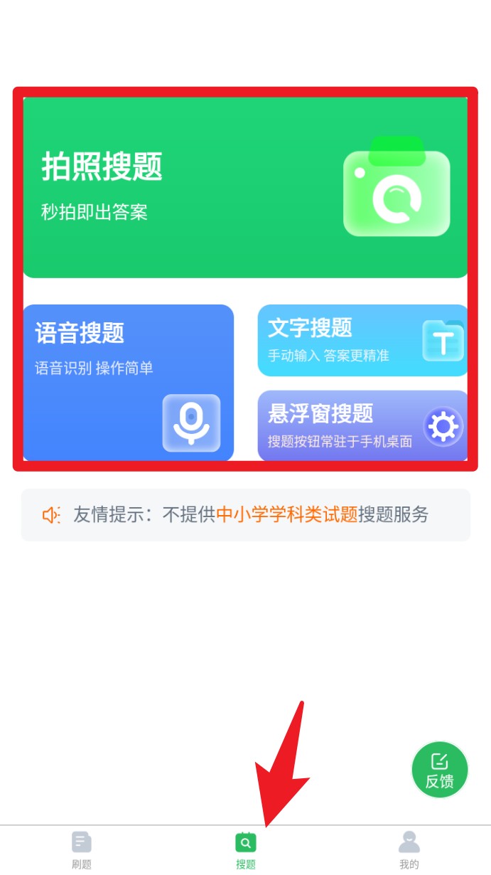 3. 点击底部搜题,可通过拍照、语音或文字方式快速搜索题目,支持悬浮窗搜索,查题更高效。