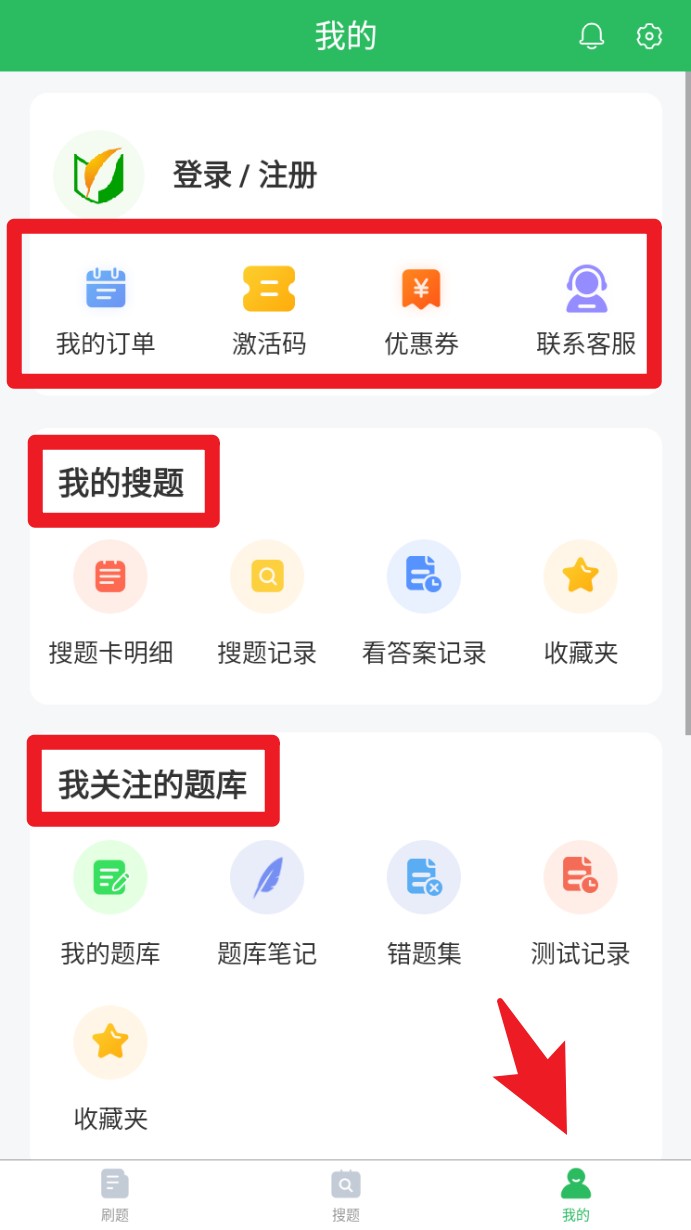 4. 进入我的页面,管理订单、激活码与客服服务,同时可查看我的题库、错题集及搜题记录。