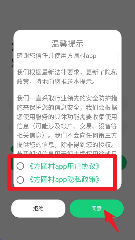 1、首次使用app时,请勾选用户协议及隐私政策后点击同意按钮以继续使用。