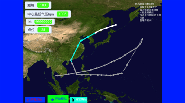 3、点位设置完毕后点击开始模拟,模拟台风路线和情况。