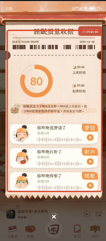 2、【鼾声梦话记录 专业睡眠质量报告】:能够监测睡眠周期,分析深睡与浅睡占比,输出专业可视化睡眠分析报告;让用户清晰了解自身睡眠质量及健康状况,会提供相应的睡眠改善建议与健康风险提示。