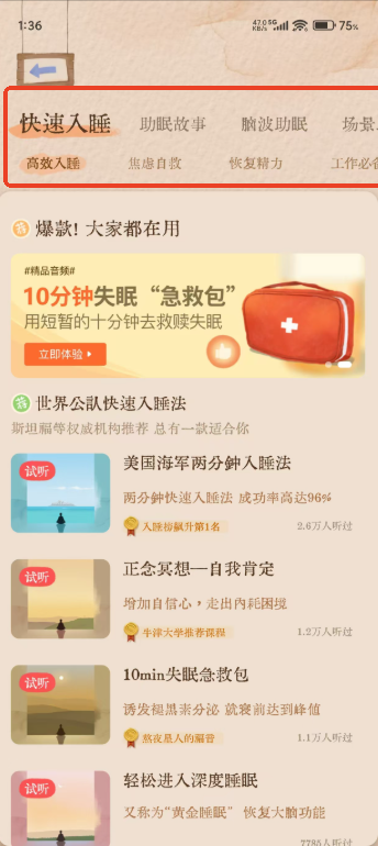 3、【世界公认快速入睡法 总有一款适合你】:包含 3 分钟入睡练习,助力睡意自然降临;提供多种世界公认的快速入睡方法,如美国海军两分钟入睡法、YogaNidra 古印度入睡法、Savanna 催眠术,以及针对烦躁失眠、压力型失眠的练习和腹式呼吸助眠法。