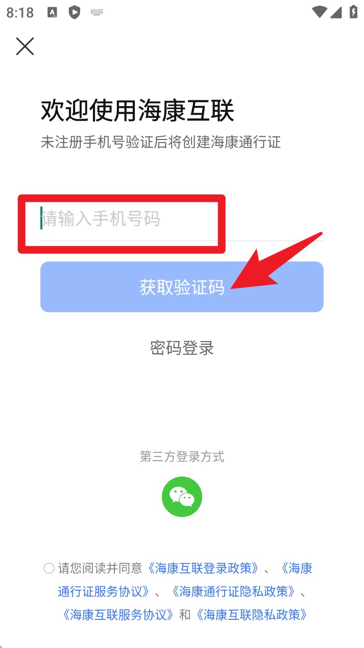 2. 进入登录页后,输入手机号并点击获取验证码,完成短信验证即可注册或登录账号,无需提前绑定权限。